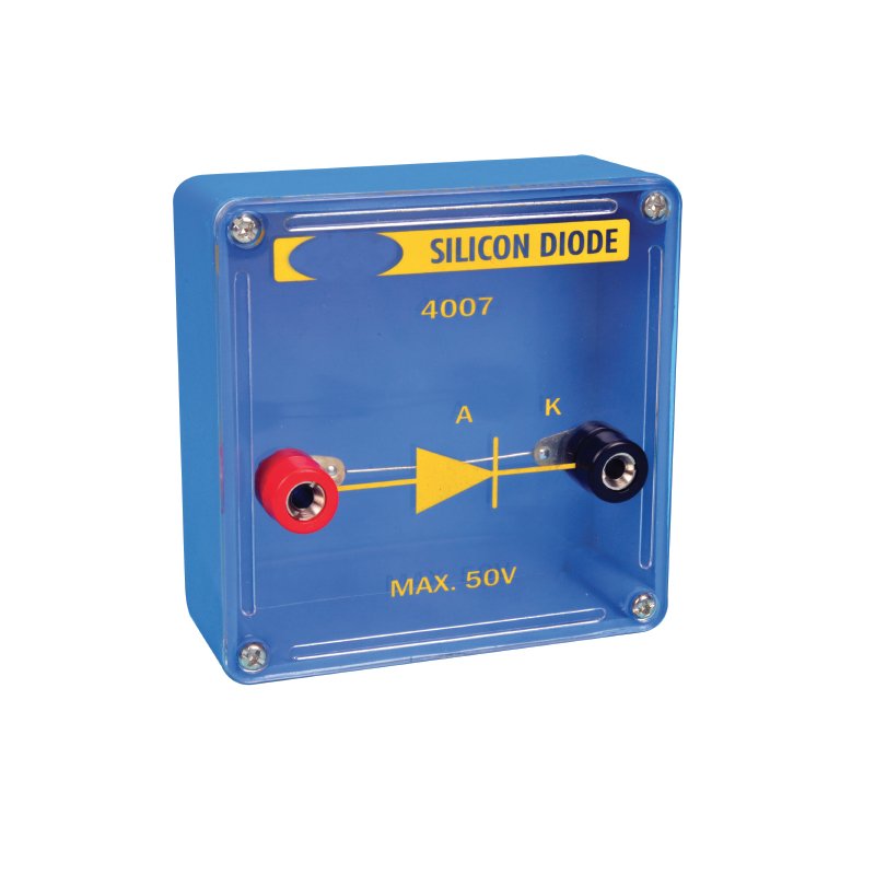 Diode de redressement, au silicium montée sur un socle transparent, avec des douilles de 4 mm couleurs et schéma du circuit électrique imprimé sur la face avant .