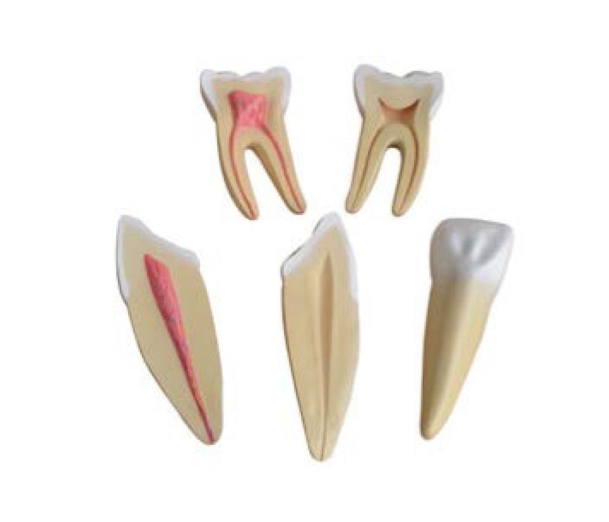 Ce modèle montre les différences morphologiques des incisives, des canines et des molaires. Les dissections de la canine et des dents molaires démontrent la structure de l’émail, de la cavité et de la pulpe dentaire .